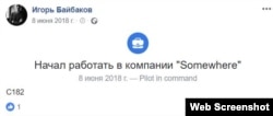 - 8 июня. Байбаков отмечает в Фейсбуке, что начал работать на новом месте (оригинал поста, сохраненная копия). Название компании он не называет, заменяя его на таинственное "Somewhere" ("Где-то"), но пишет в посте "С182" – так сокращенно обозначают модель одномоторного самолета Cessna 182, одной из самых популярных и массовых машин в истории мирового авиастроения (с 1956 года выпущено более 25 тысяч единиц).
